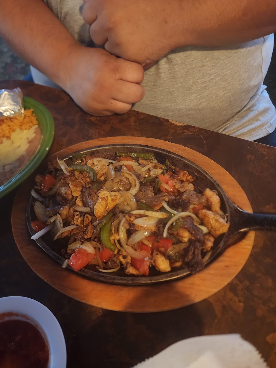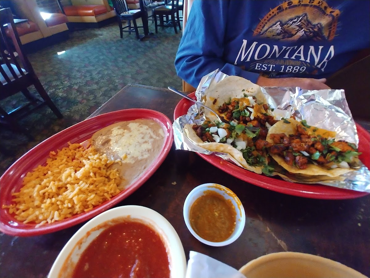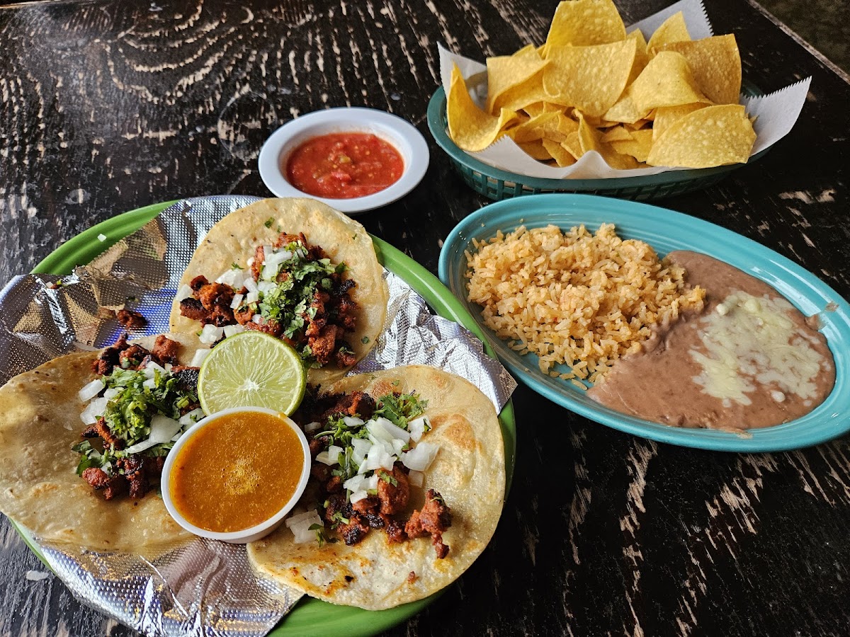 We ordered 3 steak tacos, 3 chicken tacos and a beef burrito. All came with rice and beans. We were happy with our selections and even the warm chips and 2 flavors of dip. The servers and wait staff were all very friendly and professional.